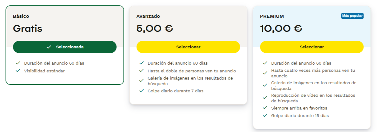• Funciones adicionales: Al elegir los planes Avanzado o Premium, tu anuncio se beneficiará automáticamente de ventajas como una galería de imágenes en los resultados de búsqueda o una mayor frecuencia de aparición.